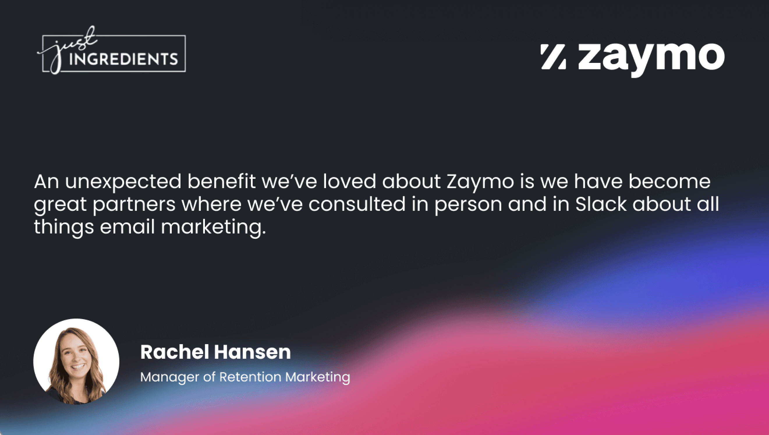 By using Zaymo's one-click purchasing features and embedded subscription portal in their emails, Just Ingredients saw a 15X ROI (Incremental revenue + savings/Zaymo's cost).